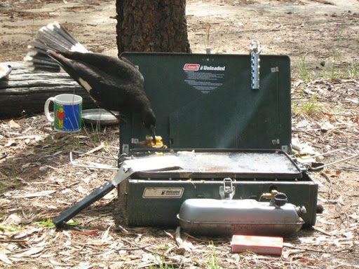 Er zijn geen goanna's op de bushcamp, misschien omdat er zoveel tractors zijn, en die zijn groter. Dus eten we de eieren zelf maar op. Maar de Kookaburra, die ons de afgelopen uren scherp in de gaten heeft gehouden (en het rondje om ons heen steeds kleiner maakte) is het daar niet mee eens. Als we even stoppen met hem bewonderen, neemt hij een duikvlucht, jat het spek van mijn bord, en neemt het triomfantelijk mee een hoge boom in. That's not a grub! It MY bacon!!