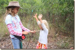 There are no Goannas at the campsite, maybe because there are tractors around, and they're bigger, so we decide to eat the eggs ourselves. But the Kookaburra that has been ogling us the last hours doesn't agree. As we stop looking at him at last, whe takes a skydive from the tree, and steals the bacon from my plate, and takes it triumphantically up a high tree. Diuwke caught her own Lizzard at last. She wanted to keep it as a pet, but alas- he had other plans...