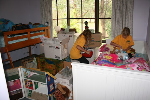 De meiden vinden het heerlijk dat de spullen er weer zijn, en de dozen met 'toys' erop geschreven zijn snel geopend, en de inhoud verspreid over twee slaapkamers, en de study, die lekker leeg is (tot de meiden dat ontdekken, dus) Iedereen slaapt heerlijk die nacht, en morgen gaan we uitpakken.