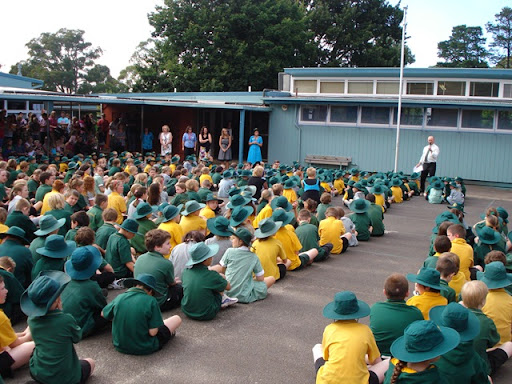 Dus maar eerst naar Diuwkes klas. Louise Saymour is gelukkig eigenlijk Nederlandse, en ze spreekt dus een beetje grappig, maar niet onverstaanbaar! We hebben even gekletst, en ons kleintje geintroduceerd, en toen was het weer; uniformshop. Wacht, wacht, wacht.... (steeds ongeduldiger- ik wilde ook de juf van Tjits nog spreken) en toen eindelijk, iemand met sleutels. Maar geen kennis, dus duurde het nog uuuuuuren voor we met de juiste maten wegliepen. Diuwke is gewoon op de gang omgekleed (en vroeg toen of ze NU dan naar de klas mocht...) en Tjits in de WC. Erg zielig, want zij had eigenlijk de meeste steun nodig, en nu viel dat allemaal in het water. In keurig geel shirt en zwarte skort (en met grote groene hoed) moest ze direct op het plein meedoen aan de assembly. We vonden het niet heel erg dat de microfoon van Mark Carver uitviel net toen hij zei dat ze 2 overzeese leerlingen nieuw hadden. Tjits vond het allemaal nog erg eng, en het liefst wil je haar dan omhullen met je armen, maar dat doet de zaak niet bepaald goed, vrees ik. Juf Baily was erg aardig en wees twee meiden aan die voor Tjits moesten zorgen (verschrikkelijk stomme meiden). Na assembly ging ieder naar zijn eigen klas, en Diuwke liep mee alsof het nooit anders was geweest. Tjits had liever dat we nog even meeliepen.