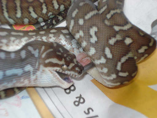 het opeten ging veel sneller dan we verwacht hadden; pythons kunnen hun onder en boven kaken losmaken van elkaar, maar ook links en rechts kunnen los van elkaar. De kop van de slang werd dus 4 keer zo breed, en kant voor kant schoof ze de muis zo naar binnen. Een fantastisch gezicht! Kop eerst; Tieske is al aardig wijder dan normaal...