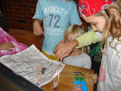Eerst moest de muis ontdooit worden, in een bak met water.