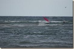 De volgende dag het echte werk; We krijgen surfles van Andrew, die vol goede moed begint, maar wel snel een beetje verward raakt van ons rare gezin. Diuwke, die zomaar op het bord springt en wegsurft, maar het na een uur op zee voor gezien houdt (en wat is de kust dan ver weg, en Diuwke klein), Tjits die vastbesloten is, maar geen bal begrijpt van de engelse instructies, Ik die na een uur vertalen nou ook wel eens een golf wil volgen, en Breg die met bandjes vol de golven induikt (tussen de kitesurfers), terwijl die natuurlijk gewoon rustig zandkastelen moet bouwen. Art zit maar te wachten aan de kant (hij is eerst nanny) maar als we dan eindelijk wisselen, staat hij gewoon op het bord, en surft weg. Niet leuk, volgens Andrew, wat heb je nou aan iemand die het gelijk kan? kitesurfing, without the kite...and surfer.