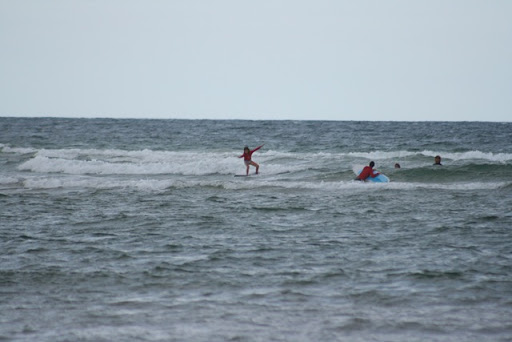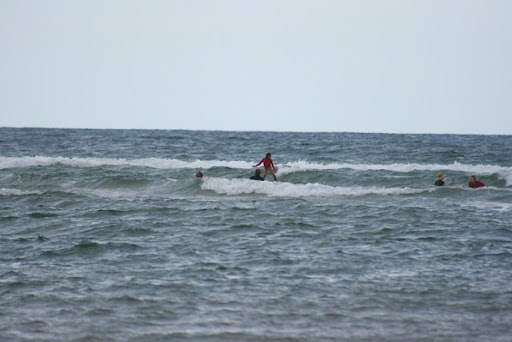 After two hours he made us do it; we all hev been standing on the board at leat one time, and we're hooked. Surfing is fun, but we need some practise....