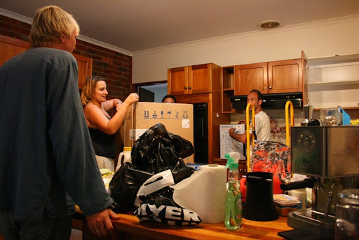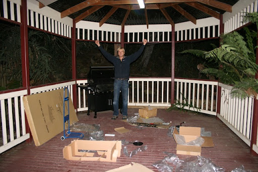Wij zijn inmiddels over naar ons huurhuis, en natuurlijk regende het zowel woensdag (tassen en koffers verhuizen) als vrijdag (de container!) pijpestelen. De eerste dagen was nog een beetje kamperen, want tot nu toe hadden we, als we een huis hadden, allerlei spullen , maar nu helemaal niks! Dat was even wennen, en de moed zakte ons een beetje in de schoenen, toen forty winks wel onze matras bracht (op de afgesproken dag!!), maar geen 'loanbase' (om die dure matras op te leggen), en Tjits matras waren ze helemaal vergeten... Hoe moest die nu slapen? Gelukkig hadden we ons verrekend in de matrassen die voor de dames kochten, en hadden we er drie (twee, drie... moeilijk hoor). Harvey Norman kwam ook redelijk op tijd (tegen vijven), met eindeloos veel dozen vol verrassingen voor de kinderen, met bijgeleverd gereedschap. Art kon dus gelijk aan de slag.