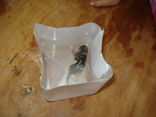 Eerst moest de muis ontdooit worden, in een bak met water.