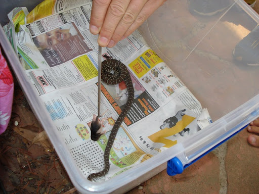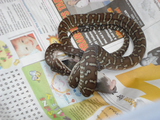 We voeren de slang in een aprte bak, omdat hij zijn kooi niet moet associeren met eten. Anders gaat hij aanvallen als je beweegt in de kooi! Tieske, zoals zij heet, moest dus in de bak en Tjits hield de ontdooide muis boven hem. Ineens schoot ze toe! En in een flits wikkelde ze zich ook direct om de muis heen. Net zo lang tot hij echt dood was...